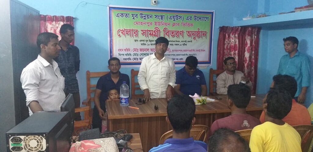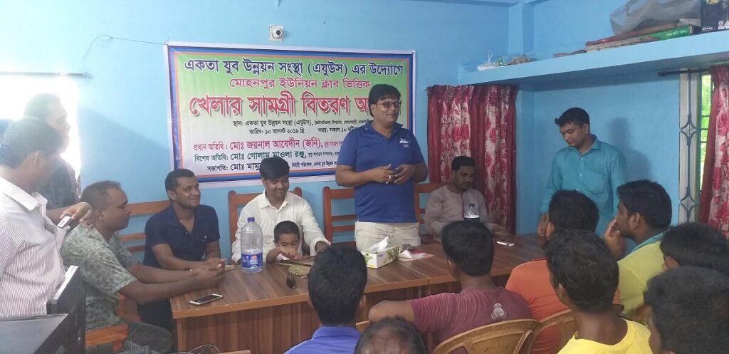 AKOTA JUBO UNNAYAN SANGSTHA organized a Sports material distribution event for Mohanpur Union Club on 2019. AKOTA JUBO UNNAYAN SANGSTHA (AJUS), a non-profit organization working for the Empowering Youth Through Sports, organized a sports material distribution event for Mohanpur Union Club on 2019. The event was held at the Mohanpur Union Club ground and was attended by a large number of people, including the club members, their families, and the local community.